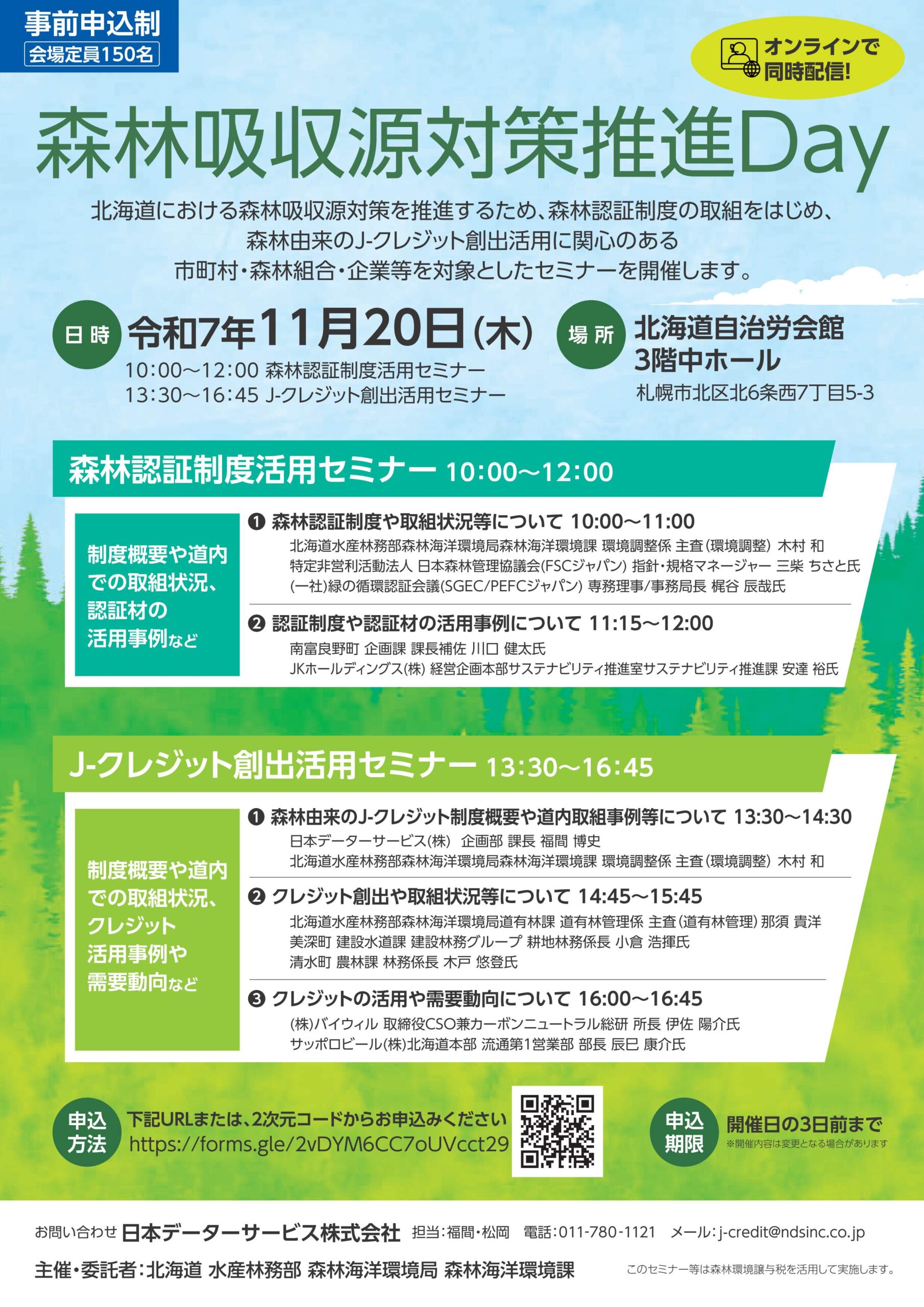 北海道における森林吸収源対策を推進するため、森林認証制度の取組をはじめ、森林由来のJ-クレジット創出活用に関心のある市町村・森林組合・企業等を対象としたセミナーを開催します。